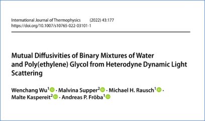 Advanced measurement techniques for diffusion coefficients pave the way to a better understanding of diffusion in chemical processes. In an open-acess paper by Wenchang Wu et al. from the Institute of Advanced Optical Technologies – Thermophysical Properties (AOT‑TP), diffusivities of polyethylene glycols (PEGs) are determined using an advanced optical measurement technique, namely heterodyne dynamic light scattering (DLS). For these investigations, our group provided molar-weight distributed PEGs as well as monodisperse PEGs we obtained by preparative HPLC.